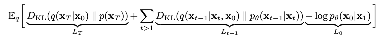 - LT: p가 generate하는 noise(x_T)와 q가 x_0라는 데이터가 주어졌을 때 generate하는 noise(x_T)간의 분포 차이
