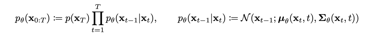 그러므로 우리는 p_θ를 활용해서 이를 approximate한다. 이 approximation은 Gaussian transition을 활용한 Markov chain의 형태를 가진다. 이를 식으로 표현하면 다음과 같다.