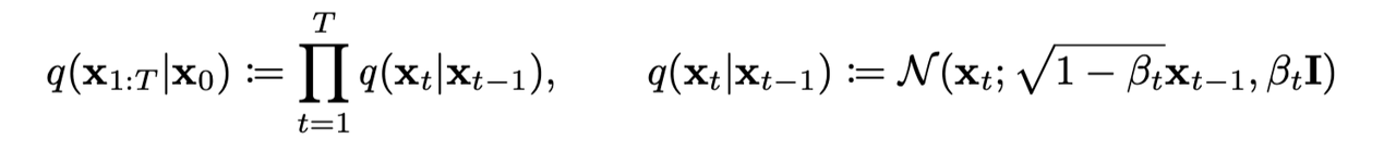 Forward Diffusion Process, q는 markov chain으로 data(x_0)부터 noise를 더해가면서 최종 noise(x_T) 형태로 가는 과정이다.(sampling의 반대 방향) 우리가 이 과정의 분포를 알아내야 하는 이유는, reverse process의 학습을 forward process의 정보를 활용해서 하기 때문이다.