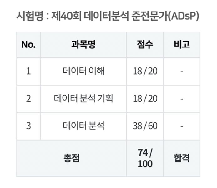 사실 ADsP는 제가 치뤘던 제 40회 회차의 시험은 합격률이 60.6%나 될정도로 합격률이 높은 시험이기 때문에, 비전공자 분들도 공부를 하신다면 누구나 합격하실 수 있는 시험이라 생각합니다!