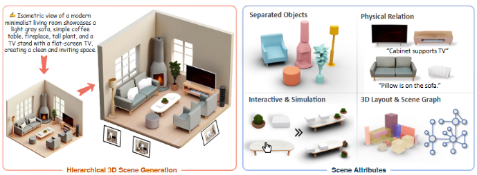 - 기존의 많은 3D scene gen은 scene 내부의 객체가 개별적으로 만들어 지는 것이 아님. 따라서 객체 편집 및 상호작용이 제한적