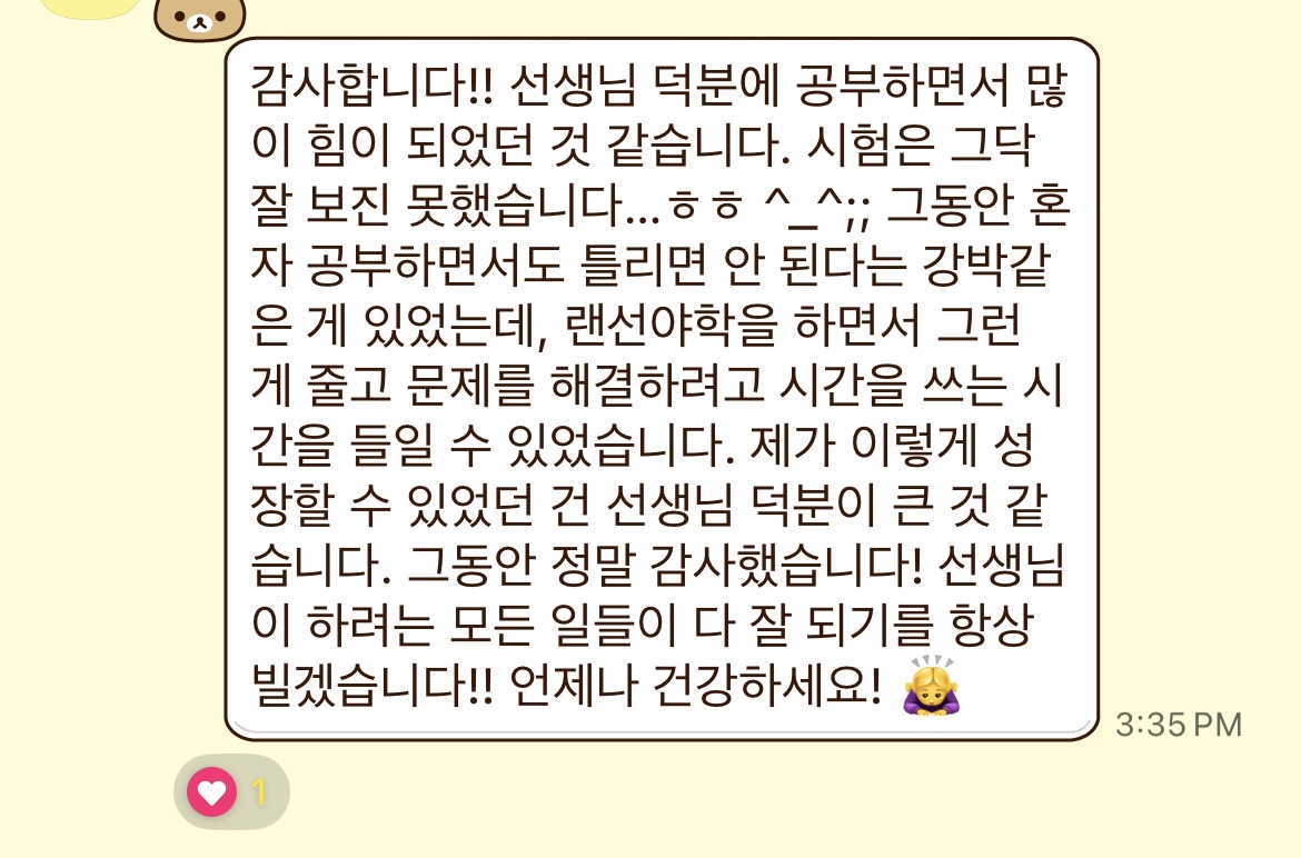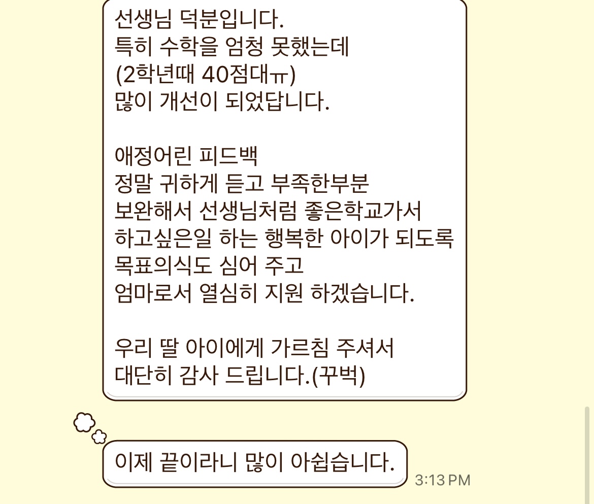 나도 사실 어릴때도 그렇고 지금도 수학을 어려워해서 최대한 내 경험을 복기하며 학생들에게 도움이 될만한 꿀팁을 많이 알려주려 노력했다. 공부 외에도 진로 재량활동도 진행해야 했는데, 매달 학생들과 각자의 꿈에 대해 이야기해보고 학생들이 좋아하는 것을 기반으로 진로 설계를 도와주는 과정이 참 즐겁고 보람있었다. 가르치는 기쁨을 느끼게 해준 고마운 학생들.